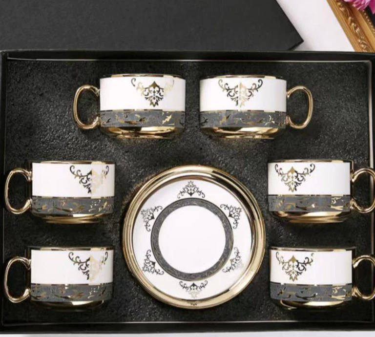 Detalhes do Produto: • Tipo: Conjunto de copos para café com pires • Composição: 6 xícaras de café + 6 pires – total de 12 peças • Material: Porcelana • Capacidade: Ideal para servir café com elegante e discrição, capacidade de 80ml • Estilo: Clássico com acabamento sofisticado – combinação com mesas minimalistas ou tradicionais • Uso: Perfeito para momentos de pausa, cafezinho, encontros íntimos ou especiais • Apresentação: Acondicionado em caixa para presente – ideal para charme